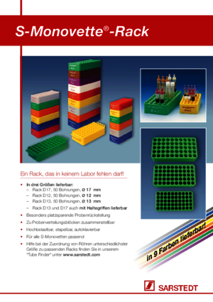 S-Monovette®-Rack S-Monovette®-Rack Sprachen: (DE) 00.10.225 [pdf, 191 KB] file_download (EN) 00.20.225 [pdf, 163 KB] file_download