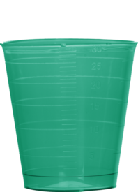 | Product description | Medicine cup, max. volume: 30 ml, (LxØ): 40 x 37 mm, Ø opening: 37 mm, green, graduated, material: PP, 75 piece(s)/bag |