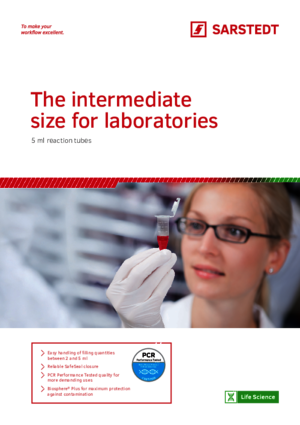 | Product description | SafeSeal reaction tube, working volume: 5 ml, material: PP, transparent, cap: natural, SafeSeal cap, cap attached, with injected graduation and writing space, PCR Performance Tested, 100 piece(s)/minigrip bag |