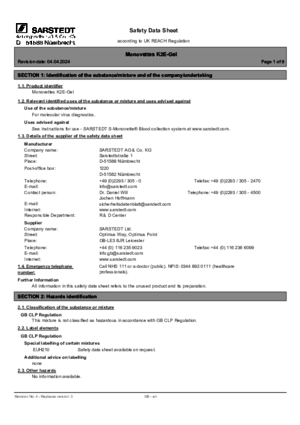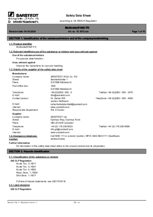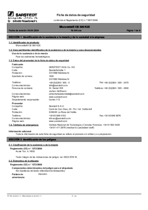 A continuación, encontrará una lista de todas las Hojas de Datos de Seguridad de los productos del catálogo de Sarstedt Group que están sujetos a estos requisitos de etiquetado (excepto los artículos personalizados). Los elementos marcados como XXX definen las Hojas de Datos de Seguridad colectivas que también son aplicables a referencias adicionales con sufijo.