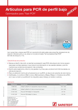 Los tubos y tiras para PCR Multiply® brindan una flexibilidad máxima. Nuestro surtido comprende recipientes unitarios, tiras de 4 y 8, así como las variantes HighProfile y LowProfile. El diseño de paredes finas del recipiente optimiza la transferencia de calor, siendo la reacción más específica y el rendimiento más elevado. La protección integrada contra contaminación de la tapa reduce de forma efectiva el riesgo de contaminación cruzada de ácidos nucleicos entre las muestras. Todos los tubos y tiras poseen en certificado "PCR Performance Tested" (calidad certificada para PCR) y se garantiza que están exentos de ADN, DNasa/RNasa e inhibidores de PCR.