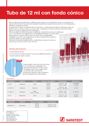 Como uno de los mayores fabricantes de tubos especiales y para centrífuga del mundo, Sarstedt fabrica tubos de fondo redondo, cónico y plano, así como con y sin borde para colocación vertical. Además del rango de los más diversos materiales, volúmenes, opciones de envasado y estándares de pureza para tubos, así como tubos con impresión o etiquetados, también podemos ofrecerles alternativas de artículos individuales, como etiquetado con código de barras.
