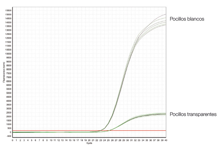A continuación se presenta un ensayo de qPCR comparativo. El resultado del ensayo representado en la Fig. 1 muestra, en primer lugar, que con idéntica cantidad de plantilla, la intensidad medida de la fluorescencia es notablemente mayor en los recipientes blancos que en los recipientes transparentes. Para las tiras para PCR transparentes y blancas de la Fig. 1, el termociclador calculó automáticamente el umbral por separado. Para la detección de las 1.000 moléculas de plantilla en los recipientes transparentes, se calculó un valor Cq medio (n = 8) de 24,87 ± 0,08, y para los recipientes blancos un valor Cq de 23,40 ± 0,07. Esto significa que en los recipientes blancos la detección se realiza antes. Esta particularidad constituye una ventaja, especialmente si sólo se dispone de volúmenes de muestra reducidos. En consecuencia, si con los consumibles transparentes ya no es posible un ciclo de PCR útil, con los consumibles blancos aún se puede obtener una detección correcta.