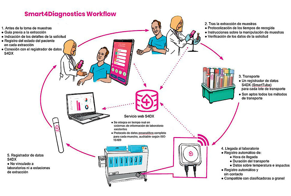 El trayecto del transporte de las muestras hasta el laboratorio es objeto de un seguimiento digital detallado en lo que respecta a temperatura, impactos y la duración del transporte. Los datos se transfieren automáticamente al sistema de información de laboratorio (SIL), cuando la muestra se recibe en el laboratorio.