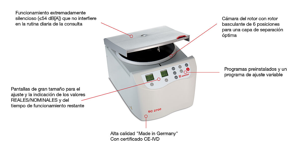 La nueva centrífuga SC 2700 está destinada especialmente para consultas médicas privadas, pequeñas unidades de laboratorio o departamentos individuales de hospitales que, en el proceso preanalítico, deseen centrifugar muestras de sangre, orina o saliva directamente después de su obtención.
