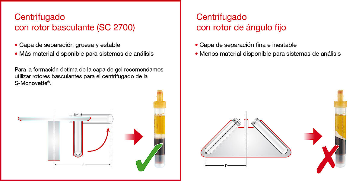 A diferencia del rotor de ángulo fijo, el centrifugado con un rotor basculante proporciona una capa de separación uniforme y homogénea. Esta barrera de difusión asegura una estabilidad exacta de la muestra y la disponibilidad de más material de muestra para los sistemas de análisis.