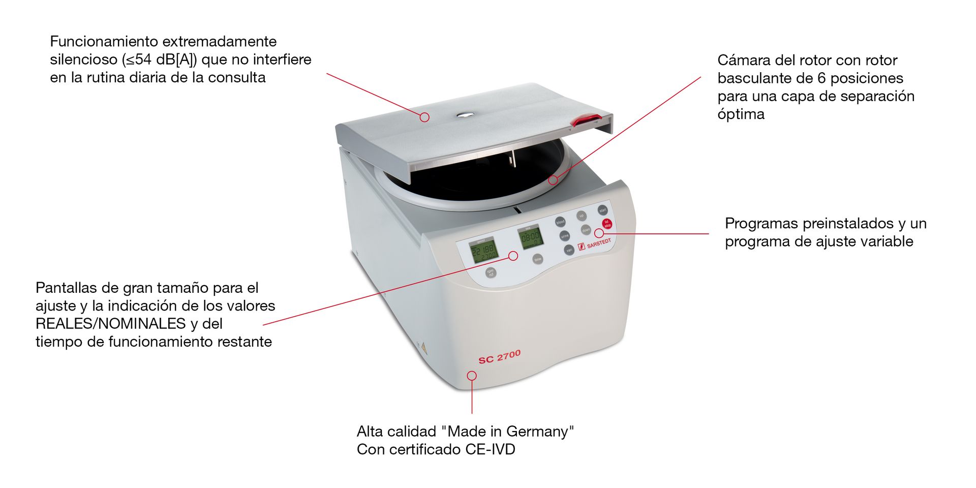 La nueva centrífuga SC 2700 está destinada especialmente para consultas médicas privadas, pequeñas unidades de laboratorio o departamentos individuales de hospitales que, en el proceso preanalítico, deseen centrifugar muestras de sangre, orina o saliva directamente después de su obtención.