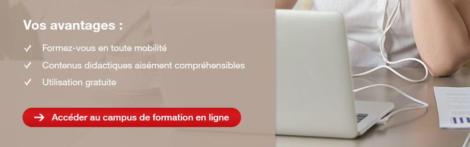 Les contenus s’articulent en de brefs modules qui permettent ainsi un perfectionnement et une acquisition d’informations ciblés. Reprenez tout simplement là où vous vous êtes arrêté.