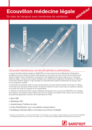 Nos écouvillons de médecine légale servent au prélèvement d’échantillons de comparaison ainsi qu’au relevé de traces d’ADN sur le lieu des faits. Une membrane d’aération au fond du tube assure le séchage sûr de l’écouvillon dans le tube. Le processus de stérilisation à l’ETO spécialement développé pour les besoins de la médecine légale et les conditions de pureté très élevées qui sont respectées au cours du processus de production garantissent l’absence de résidus d’ADN sur les écouvillons de médecine légale.