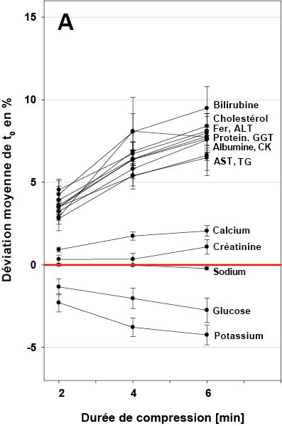 Les premières valeurs de mesure changent dès la première minute de compression veineuse. Ce phénomène a notamment des conséquences significatives sur les valeurs associées à un intervalle de référence réduit.