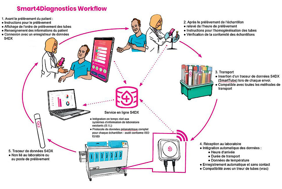 Le transport des échantillons jusqu’au laboratoire fait aussi l’objet d’une surveillance numérique au plus près en termes de température, de chocs subis et de durée de transport. La transmission des données vers le système d’information de laboratoire (SIL) se fait de manière automatique à la réception des échantillons au laboratoire.