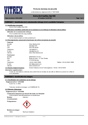 Conformément au règlement (CE) 1907/2006 (REACH), au règlement (CE) 1272/2008 (CLP), à la directive 98/79/CE (IVDD), ainsi qu'au règlement (UE) 2017/746 (IVDR) actuellement en vigueur, les fiches de données de sécurité (FDS) font partie des éléments essentiels de la communication des informations relatives à la sécurité pour la manipulation des produits ou substances dangereux, y compris les informations relatives à la sécurité tout au long de la chaîne d'approvisionnement jusqu'à l'utilisateur.