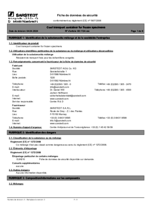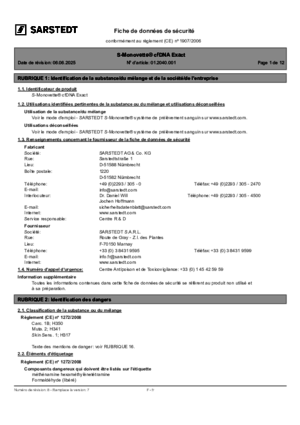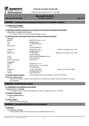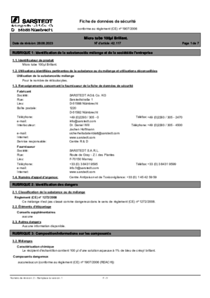 Vous trouverez ci-dessous une liste de toutes les fiches de données de sécurité des produits des gammes du Groupe Sarstedt qui sont soumis à des exigences d'étiquetage (à l'exception des articles personnalisés). Les éléments marqués XXX définissent des fiches de données de sécurité collectives qui sont aussi applicables aux numéros REF supplémentaires suffixés.