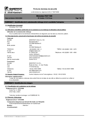 Conformément au règlement (CE) 1907/2006 (REACH), au règlement (CE) 1272/2008 (CLP), à la directive 98/79/CE (IVDD), ainsi qu'au règlement (UE) 2017/746 (IVDR) actuellement en vigueur, les fiches de données de sécurité (FDS) font partie des éléments essentiels de la communication des informations relatives à la sécurité pour la manipulation des produits ou substances dangereux, y compris les informations relatives à la sécurité tout au long de la chaîne d'approvisionnement jusqu'à l'utilisateur.