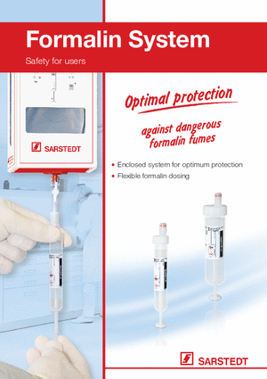 ホルムアルデヒドはヒトに有毒で、直接触れるると皮膚炎を引き起こすことがあるため、問題になっています。たとえ低濃度であっても癌を誘発する恐れがあります。当社のホルマリンシステムは、ユーザーがホルマリンに触れないよう、また組織標本をコンタミすることなく固定することが可能な密閉ユニットです。組織標本は採取後、中性で調製液無しのS-Monovette®に入れることが出来ます。その後、S-Monovette®はザルスタットホルマリンシステムに接続され、ホルマリンが充填されます。固定化はこれで終了です。