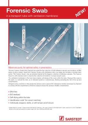 フォレンシックスワブは、犯行現場における鑑識サンプルやDNA痕跡の採取に使用されます。チューブ底部の通気性膜により、スワブはチューブ内で自然に乾燥します。科学捜査用に特別に開発されたEtO殺菌プロセスと、高レベルでクリーンな製造過程により、DNAフリーが保証されています。