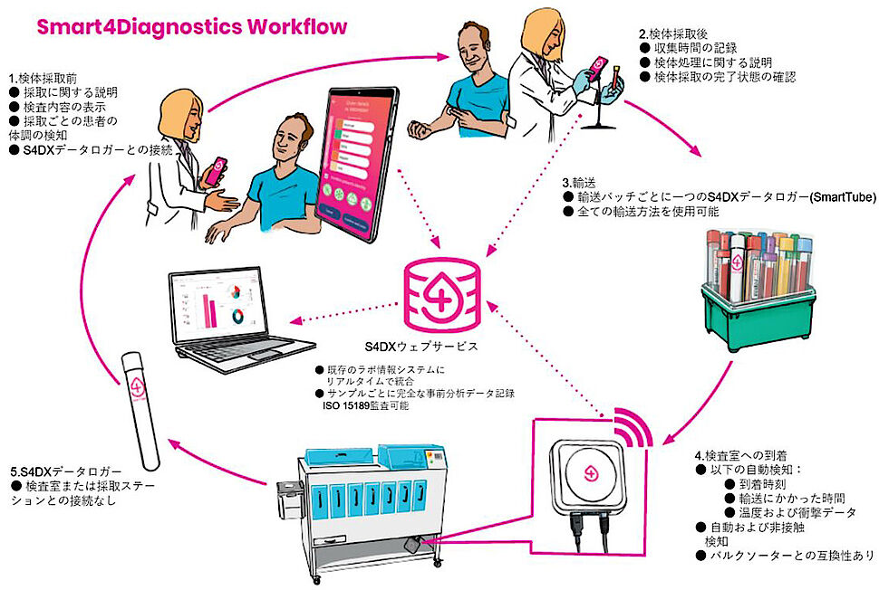 検体の採取場所から検査室までの輸送に関しては、温度、振動、輸送所要時間が正確に記録されます。検体が検査室に到着すると、それらデータがラボ情報システム(LIS)に自動的に転送されます。
