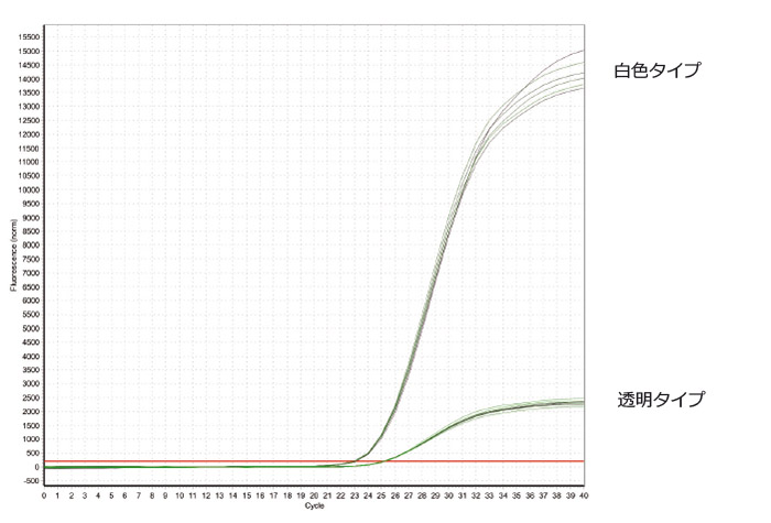 透明のチューブを使用すると、蛍光分散により隣接ウェルで蛍光が検出されることがあります。白色PCR製品の場 合は不透光性の材質を使用しているので、サーモサイクラーの蛍光検出器が隣接ウェルの蛍光シグナルを検出しません。