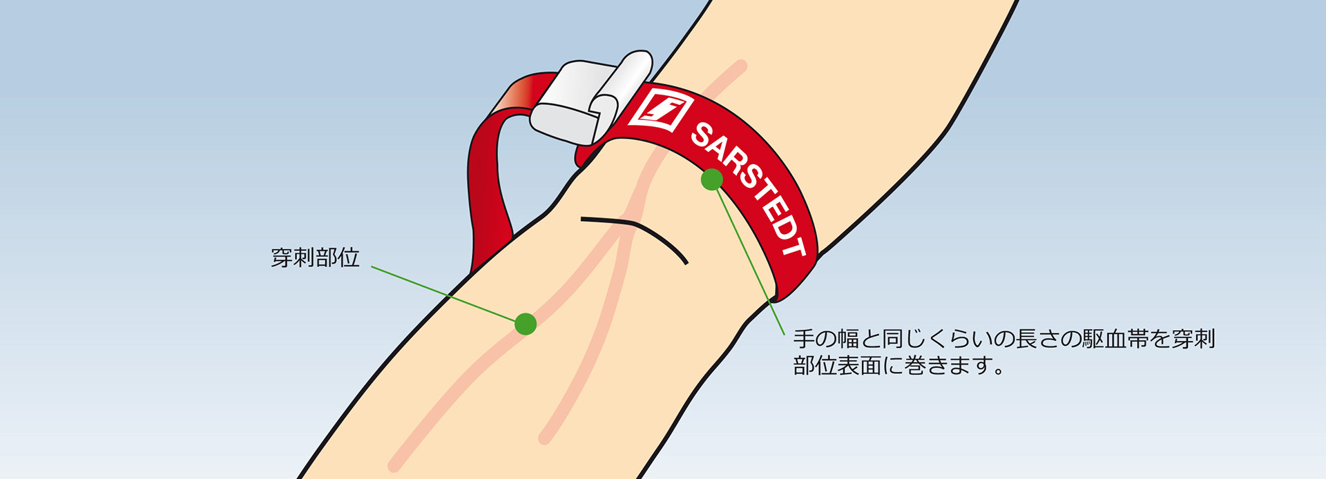 手の幅と同じくらいの長さの静脈駆血帯を希望の穿刺部位に巻きます。腕に血液が流れ続けるように、脈がまだ感