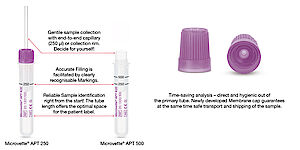 Microvette® APT 500は250~500 μlまでの容量の採血が可能です。これは採血容量250~500 μlを必要とする、自動血液分析システムのための採血容器として最適です。採血用リム全体による採血で、最適な血液・抗凝血剤混合を促進し、血栓形成を防止します。