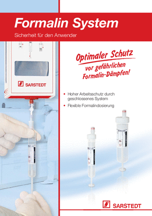 Formaldehyd steht im Fokus der Kritik, da der Stoff auf den Menschen toxisch wirkt und bei Körperkontakt Hautreizungen hervorruft. Bereits geringe Konzentrationen können krebserregend sein. Unser Formalin System bildet eine geschlossene Einheit und ermöglicht die kontaminationsfreie Fixierung von Gewebeproben, ohne dass der Anwender in Kontakt mit Formalin kommt. Nach der Entnahme wird die Probe in eine neutrale, nicht vorgefüllte S-Monovette® überführt, die anschließend an das Formalin System angeschlossen und mit Formalin befüllt wird. Die Fixierung der Probe ist damit abgeschlossen.