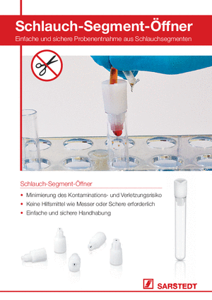 Der Schlauch-Segment-Öffner (S-S-Ö) stellt für das Kreuzprobenlabor eine erhebliche Verbesserung hinsichtlich Sicherheit und Hygiene dar. Das Öffnen eines Schlauchsegments von einer Blutbeutelkonserve muss nicht mehr mit Hilfsmitteln wie Messer oder Schere etc. erfolgen. Bei dieser Arbeitsweise entsteht ein hohes Verletzungs- und Kontaminationsrisiko. Der S-S-Ö eliminiert diese Gefahren durch die einfache und praktikable Anwendung.
