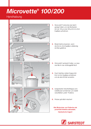 Die Microvette® bietet ideale Eigenschaften für die kapillare Blutentnahme, kann jedoch auch für die venöse Abtropfmethode verwendet werden. Alternativ können die präparierten Mikro-Probengefäße mit anhängendem Deckel oder Schraubverschluss verwendet werden. Diese sind optimal für die venöse Abtropfmethode geeignet.