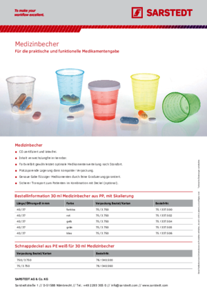 Nur sauberes und korrektes Sammeln von Proben gewährleistet richtige Analysenergebnisse. Die große Auswahl anwenderfreundlicher Urinbecher erfüllt sämtliche Anforderungen für die Sammlung, den Transport und die Lagerung. Das Produktprogramm mit verschiedenen Volumina sowie Schnapp- und Schraubverschluss Varianten erfüllt das breite Spektrum individueller Anforderungen.