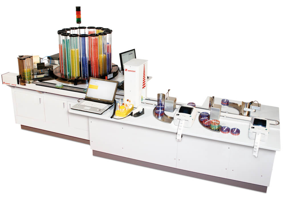 Das Petrischalen-Transfersystem PTS fördert die vom POS 720 bereitgestellten Plattenstapel zu den Ausstreichplätzen. Es wird kundenspezifisch konfiguriert, ist freistehend und kann innerhalb bestimmter Grenzen in der Höhe angepasst werden. Labortische bzw. Werkbänke werden an das PTS herangerückt.