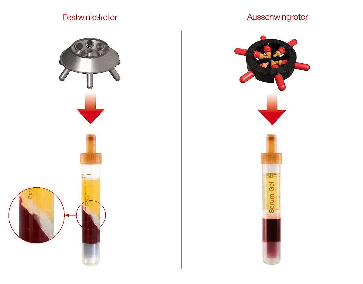 Es gibt Zentrifugen mit einem Festwinkelrotor und mit einem Ausschwingrotor. Grundsätzlich können die Probenröhrchen mit beiden Rotoren verarbeitet werden. Der Unterschied zeigt sich bei Gel-Röhrchen in der Ausprägung der Gelschicht.