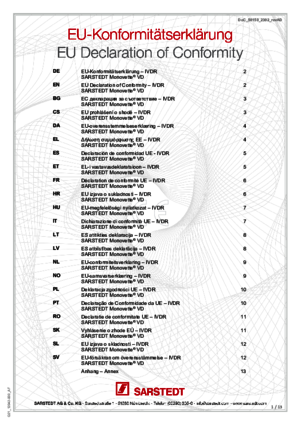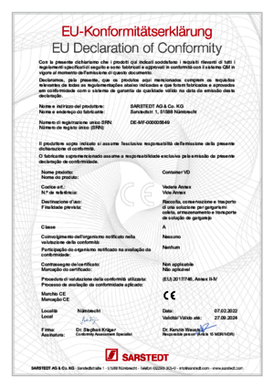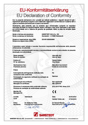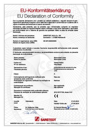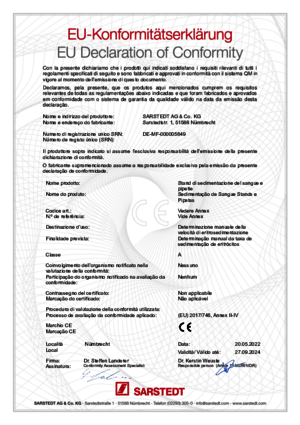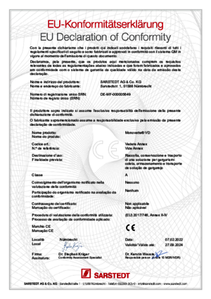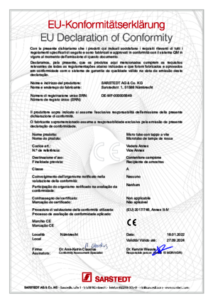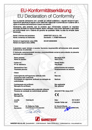 Com as Declarações de Conformidade da UE de nossos dispositivos de diagnóstico in vitro, confirmamos a conformidade com os requisitos essenciais da Diretiva do Conselho 98/79 / EC sobre dispositivos de diagnóstico in vitro (IVDD) e da Lei Alemã de Dispositivos Médicos.