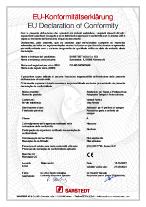 Todas as agulhas S-Monovette® e agulhas (de segurança) (Safety-) Multifly® são embaladas estéreis individualmente e isentas de pirogênios.