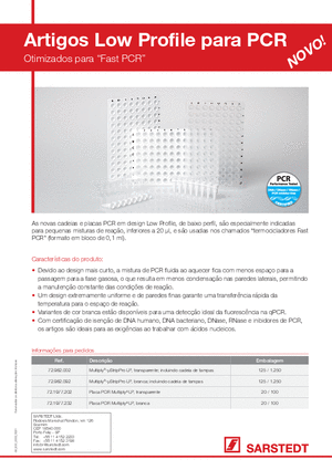 A princípio, existe a possibilidade de autoclavar nossos recipientes e placas PCR, por serem de polipropileno, sem que isso influencie suas propriedades materiais. Contudo, todos os recipientes e placas PCR Multiply® da Sarstedt são fabricados em condições de sala limpa, isentos de DNasen/RNasen, de DNA e de inibidores de PCR ("PCR Performance Tested"). Desta forma, os parâmetros mais importantes para um resultado PCR confiável ficam assegurados desde o início e nossos recipientes e placas PCR podem ser imediatamente usados para a reação PCR. Por isso desaconselhamos a autoclavagem dos recipientes e das placas PCR com certificação "PCR Performance Tested", dado que, com este passo e contrariando sua intenção, existe o perigo de contaminar os materiais com ácidos nucleicos.