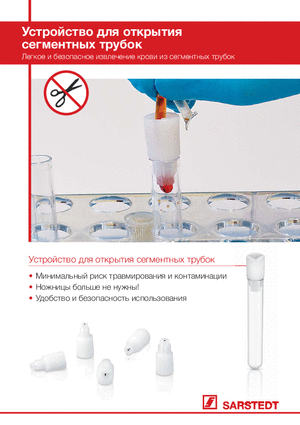 Открыватель сегментных трубок повышает безопасность и гигиеничность при работе с перекрёстными пробами в лаборатории. Больше не понадобится открывать сегменты трубок пакета с консервированной кровью при помощи ножа, ножниц и т.п. Использование таких вспомогательных средств может привести к риску травмирования и контаминации. Открыватель исключает эти риски благодаря простоте и практичности своего применения.
