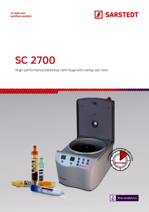 Centrifuge, SC 2700, supply voltage: 115 - 230 V, centrifugation up to max. 2,700 x g, incl. swing-out rotor 6-fold and tube holder 1-fold for tubes up to 100 mm length, for separation of serum/plasma from the blood cells, 2 preset programmes and 1 variable programme
