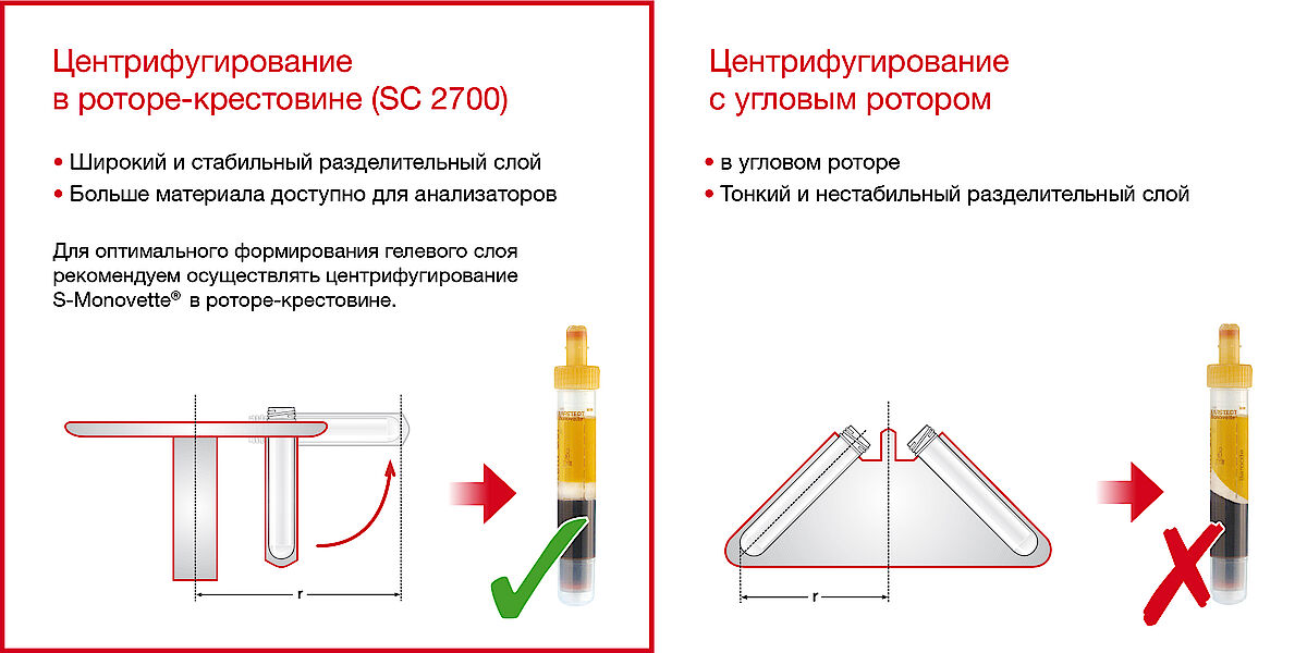 В отличие от центрифуг с угловым ротором центрифугирование в роторе-крестовине позволяет сформировать равномерный, однородный разделительный слой. За счёт этого диффузионного барьера обеспечивается стабильность образца и большее количество материала для анализаторов.