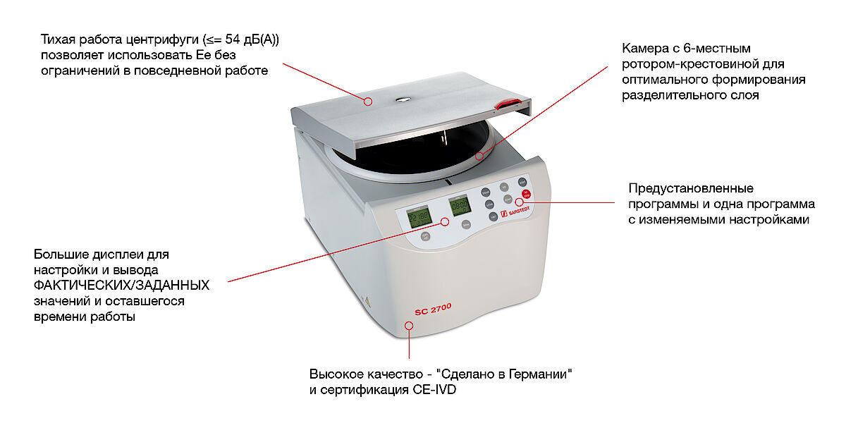 Центрифуга SC 2700 производится в Германии, отличается высоким качеством и надёжностью, что подтверждено сертификатом CE-IVD.