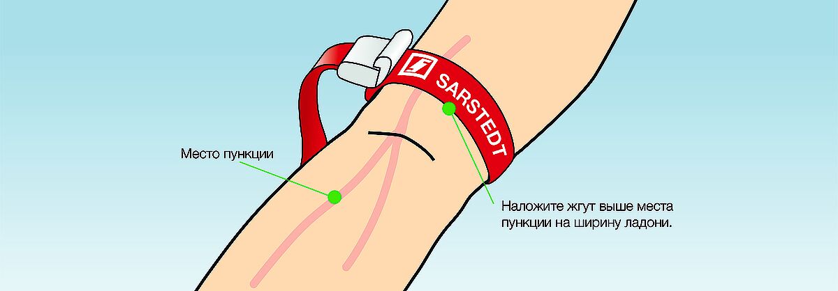 Наложить жгут примерно на ширину ладони выше выбранного места пункции. Пульс должен ещё