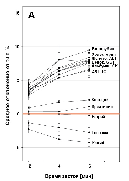 Уже спустя 1 минуту после пережатия вены изменяются первые показатели. Особенно выражается это в случае значений с малым референсным диапазоном.
